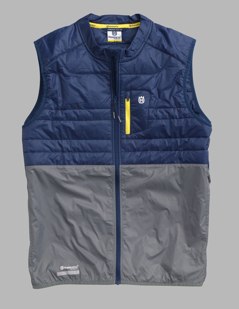 Funktionsväst i lättvikt. Lätt vadderad upptill. Bröstficka med dragkedja och Husqvarna-logga. Gömda fickor med dragkedjor fram. Mjuka elastiska band runt midja och armhålor. Ficka i nedre rygg. ”Pioneering Since” loggapå ryggen. Vattenresistent. 100% nylon.