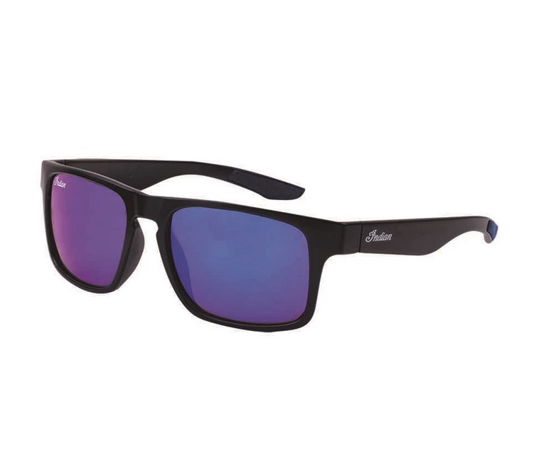 Indian Atlanta Solglasögon Lägg till snygg färg med dessa mattsvarta solglasögon. Lättvikts 100% polykarbonat mattsvart ram med blå gummidetaljer på bågarna. Premium 6R kurvig grå polykarbonatlins med blå Revo-beläggning. Splittringsbeständiga linser erbjuder 100 % UVA+UVB-skydd och har anti-im-beläggning. Indian Motorcycle®…