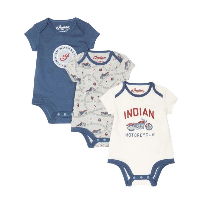 Indian Baby Bodysuit Söta baby bodys i tre olika varianter. vit med blå kant och Indian motorcyclegrafik, blå med vit skrift ”I”-logotyp och grå med blå kant och allroundtryck av Indian motorcyklar och vägar. Stängning med tre knappar i botten…