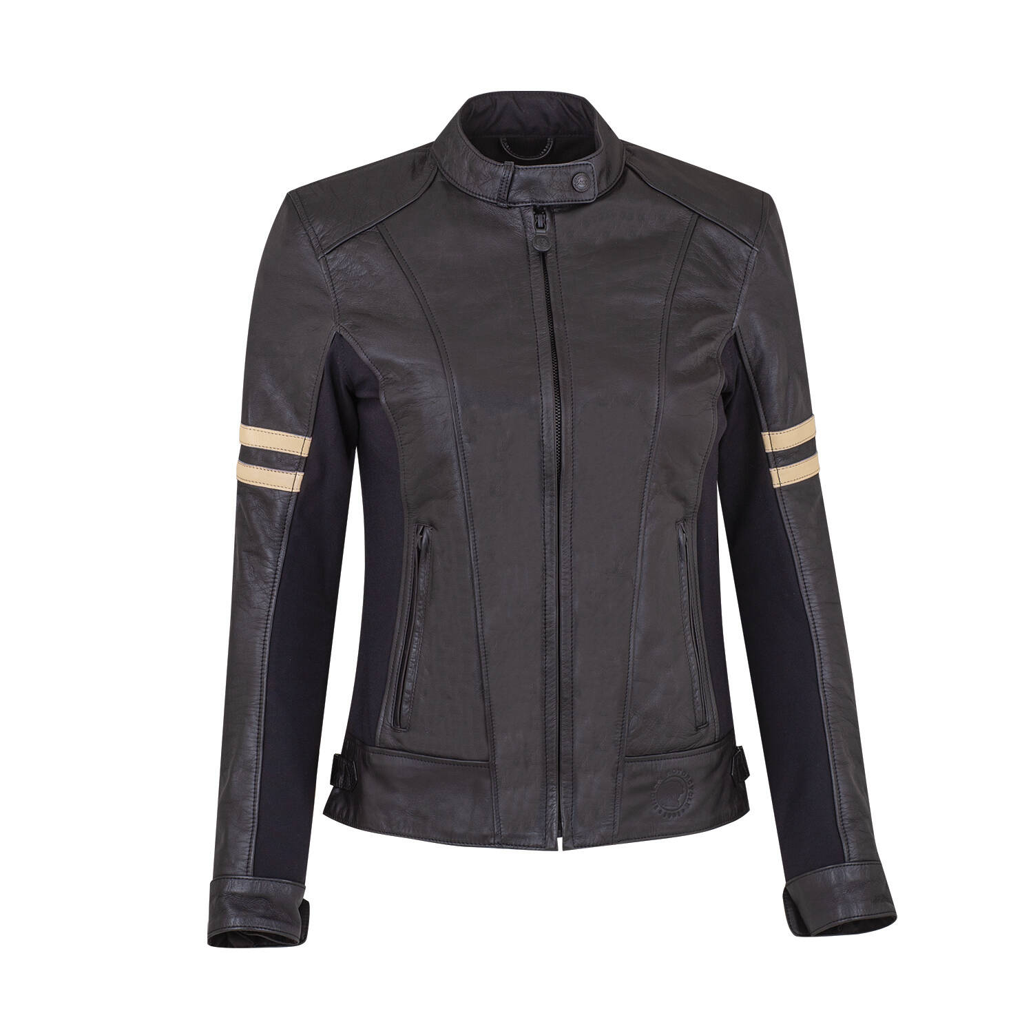 En mjuk, svart läderjacka med stretch paneler på sidorna och vita racing stripes på armarna. CE-Godkända skydd (EN 1621-1:2012) Yttertyg: 100% Läder Innerfoder: 100% Polyester Storlekar XS-3XL