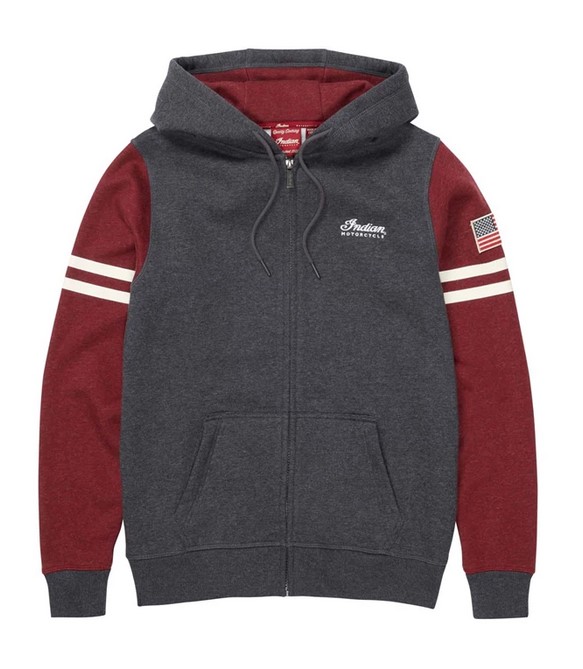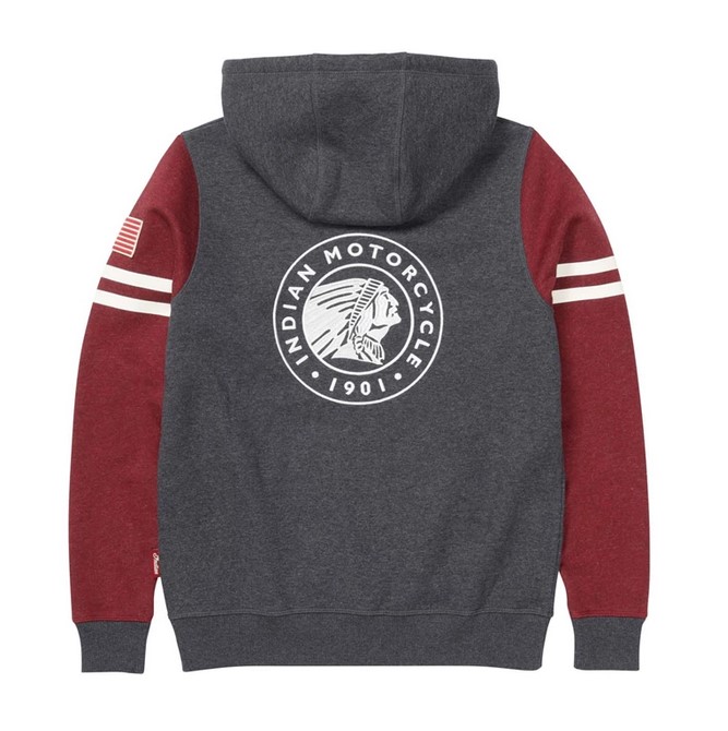 Indian Contrast Hoodie DAM Stor broderad indian huvudbonad logotyp för motorcycle på baksidan. Liten broderad logotyp på framsidan. Amerikansk flagga patch på axeln. Huva med dragsko. Dragkedja fram med indian motorcycle-logotyp. Material: 70% Bomull 30% Polyester