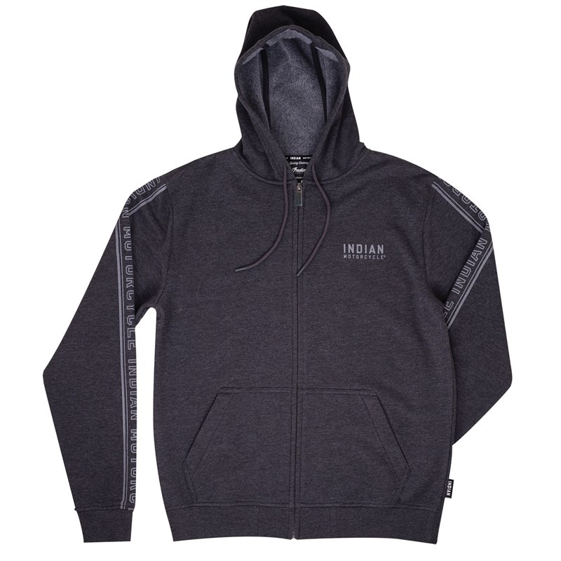 Indian Tonal Gray Hoodie Huvtröja med bomullsblandning är lätt men ändå mysig. Indian motorcykel på bröstet och längs ärmarna, Grå-på-grå färg skapar en enkel men ändå enastående look. Tröjan har dragkedja för enkel av och på tagning.