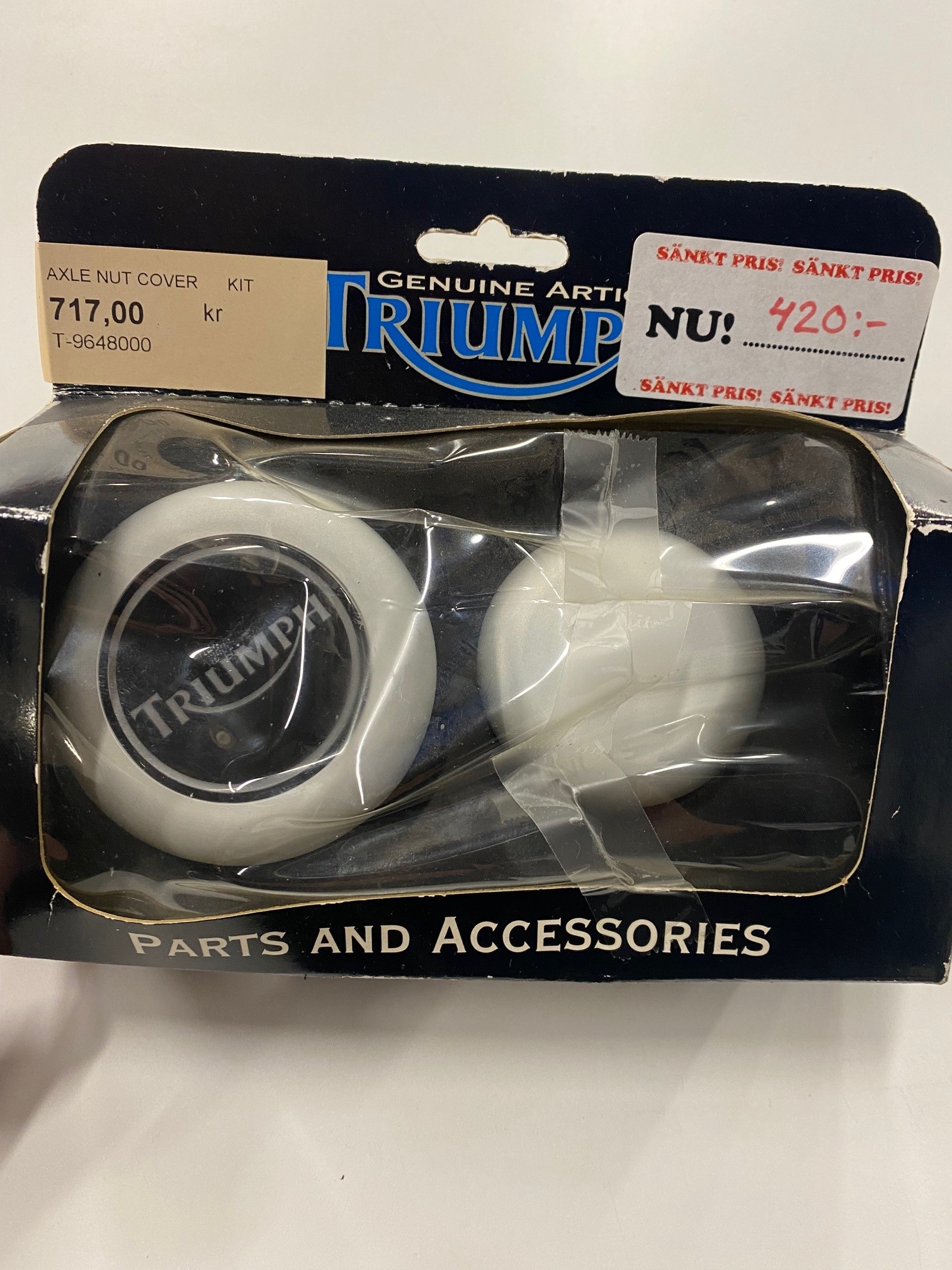 Kåpa med Triumph-logga för framaxelmutter. A9648000 AXLE NUT COVER KIT CLR ANOD
